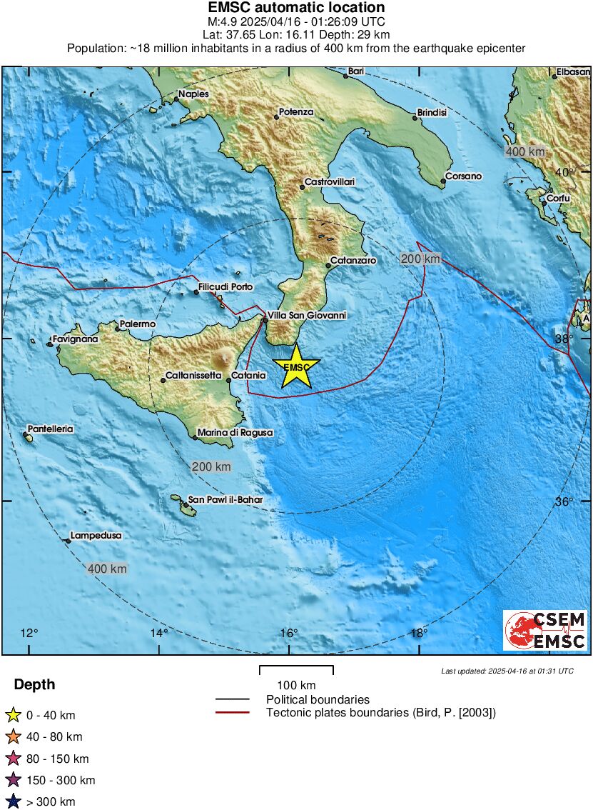 Ισχυρός σεισμός μεγέθους 4,8 βαθμών της κλίμακας Ρίχτερ σημειώθηκε τα ξημερώματα της Μεγάλης Τετάρτης στην θαλάσσια περιοχή μεταξύ της νότιας Ιταλίας και της Σικελίας.