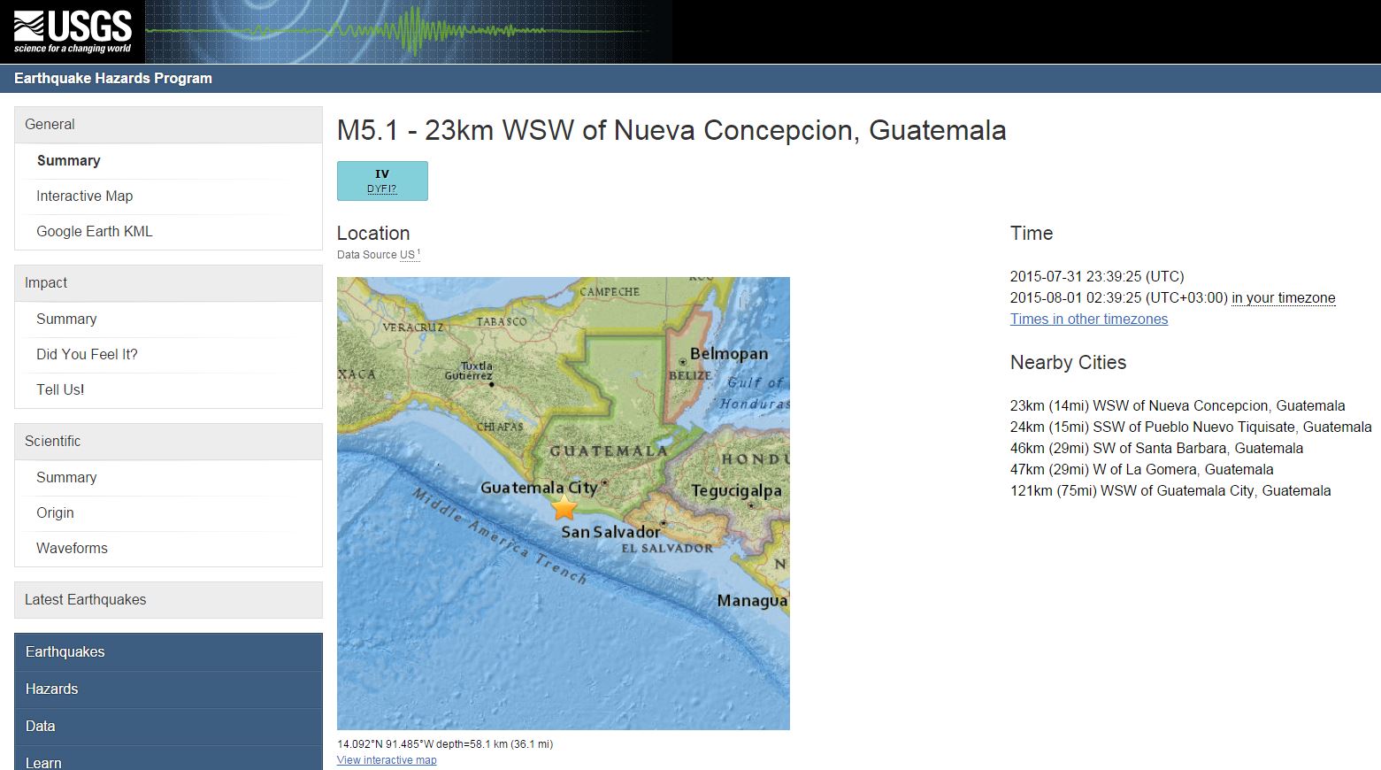 Σύμφωνα με την μέτρηση του αμερικανικού γεωλογικού ινστιτούτου (USGS), ο σεισμός σημειώθηκε στις 02:39 (ώρα Ελλάδας) και είχε επίκεντρο 121 χλμ δυτικά-νοτιοδυτικά της πόλης της Γουατεμάλας. Το εστιακό βάθος υπολογίστηκε στα 58 χλμ.