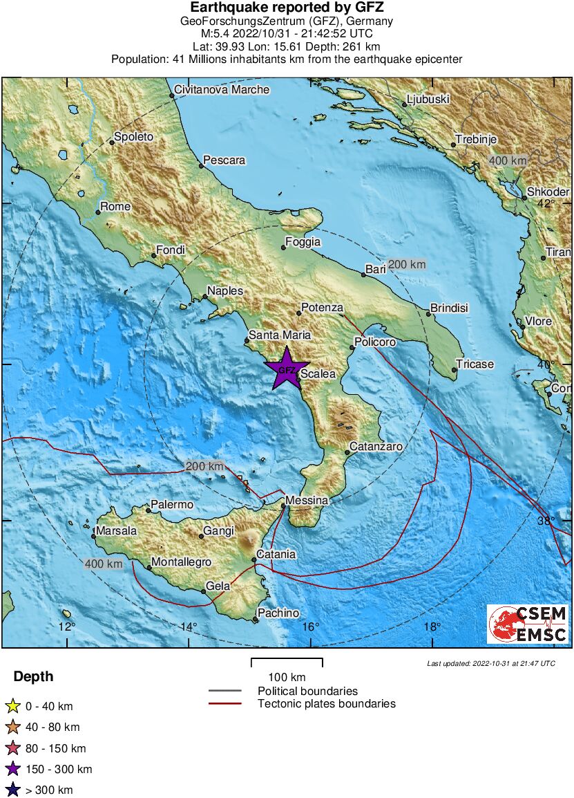 Σεισμός μεγέθους 5,4 βαθμών της κλίμακας Ρίχτερ σημειώθηκε αργά το βράδυ της Δευτέρας (31/10), στις 21:42 τοπική ώρα (23:42 ώρα Ελλάδος) σε περιοχή της νότιας Ιταλίας, σύμφωνα με την αυτόματη προκαταρκτική λύση του Ευρωπαϊκού – Μεσογειακού Σεισμολογικού Ινστιτούτου (EMSC).