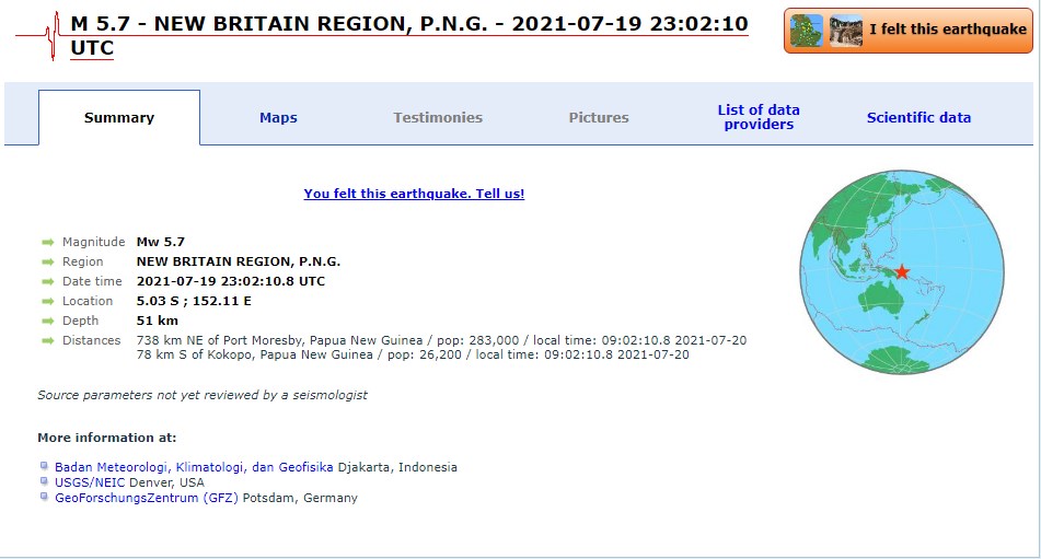 Σεισμική δόνηση μεγέθους 5,7 βαθμών της κλίμακας Ρίχτερ σημειώθηκε στην Νέα Γουινέα, στην θαλάσσια περιοχή κοντά του Κόκοπο, σύμφωνα με τις μετρήσεις του Ευρωπαϊκού Μεσογειακού Σεισμολογικού Κέντρου.