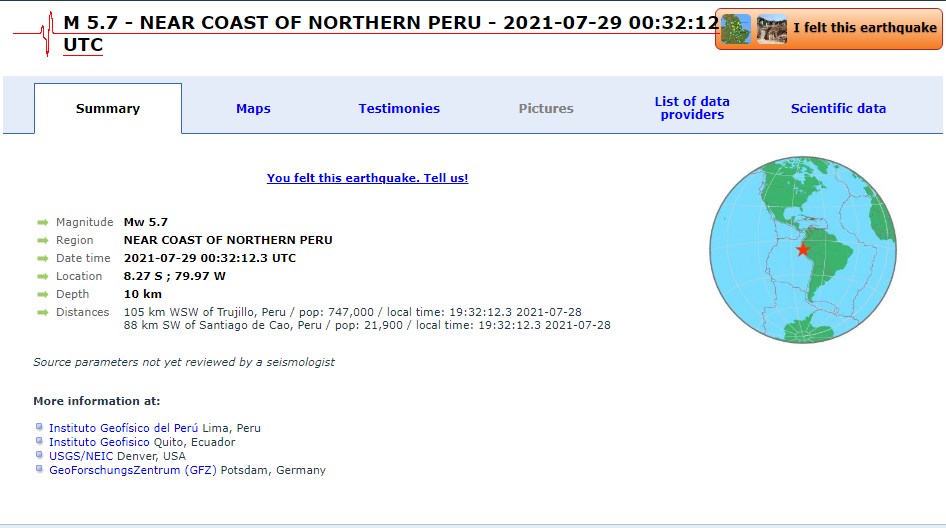 Η δόνηση είχε εστιακό βάθος 10 Χλμ. και επίκεντρο στα 88 Χλμ. νοτιοδυτικά της πόλης Santiago de Cao.