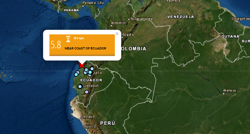 Σεισμός μεγέθους 5,8 βαθμών της κλίμακας Ρίχτερ σημειώθηκε κοντά στην παράκτια περιοχή του Ισημερινού αργά το βράδυ του Σαββάτου (τοπική ώρα), ανέφερε το Ευρωπαϊκό Μεσογειακό Σεισμολογικό Κέντρο (EMSC).