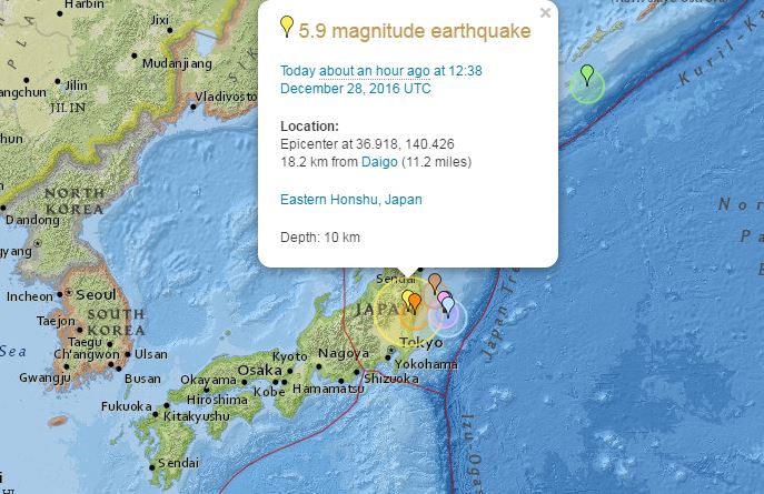 Σεισμός σημειώθηκε στην Ιαπωνία, στα βορειοανατολικά του Τόκιο, ανακοίνωσαν η ιαπωνική μετεωρολογική υπηρεσία και το αμερικανικό ινστιτούτο γεωφυσικής USGS που εκτίμησαν το μέγεθός του στους 5,9 βαθμούς.