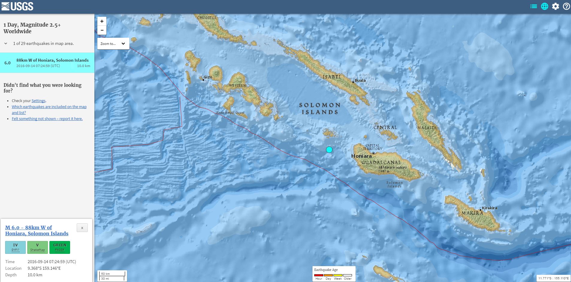 Επιφανειακός σεισμός 6 Ρίχτερ σημειώθηκε σήμερα 89 χλμ. δυτικά των Νησιών του Σολομώντα, στον Νότιο Ειρηνικό, ανέφερε το Γεωφυσικό Ινστιτούτο των Ηνωμένων Πολιτειών.