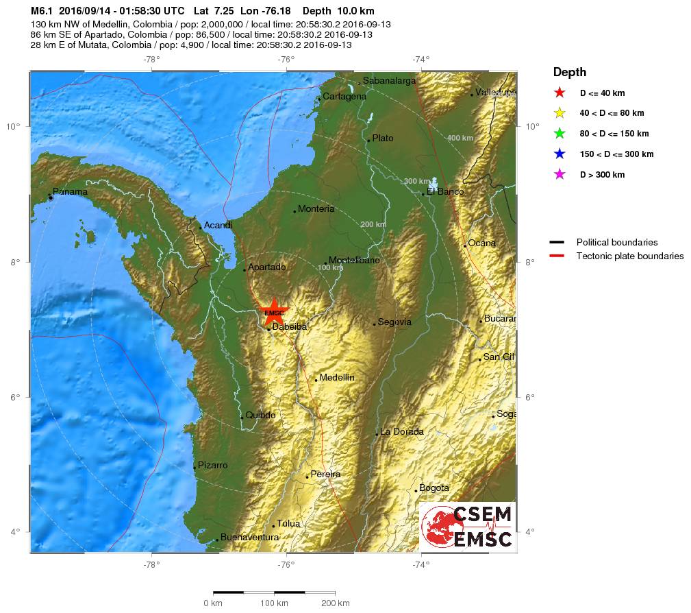 Ισχυρός σεισμός, 6 Ρίχτερ, σημειώθηκε το πρωί στις 4.58 ώρα Ελλάδας στη βορειοδυτική Κολομβία.