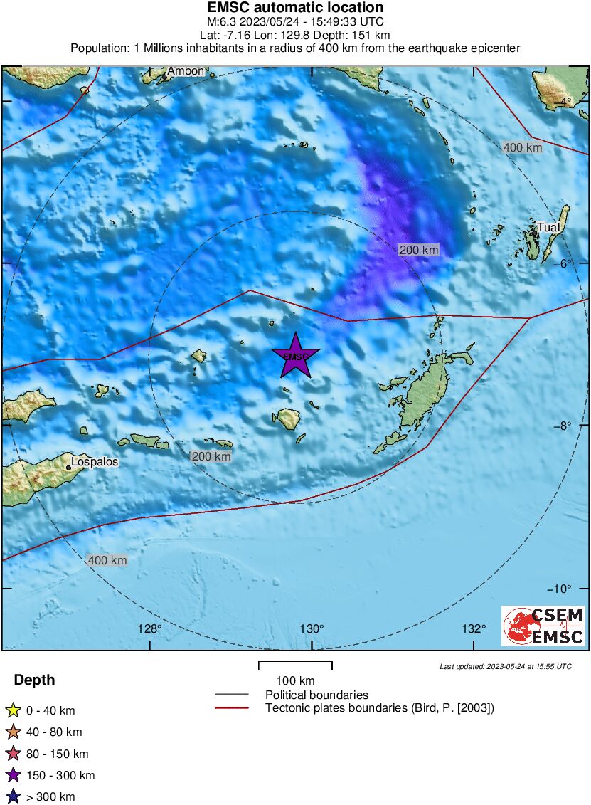 Σύμφωνα με το το Ευρωμεσογειακό Σεισμολογικό Κέντρο (EMSC), το επίκεντρο της σεισμικής δόνησης εντοπίζεται 398 χλμ. νοτιοανατολικά του Άμπον και 323 βορειοανατολικά του Λοσπάλος του Τιμόρ-Λέστε. Το εστιακό βάθος του σεισμού υπολογίζεται στα 171 χλμ.