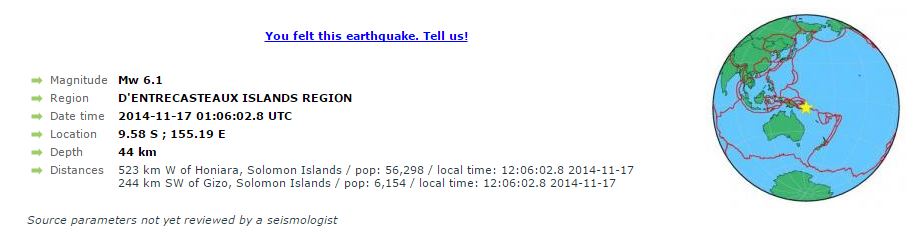 Ισχυρή σεισμική δόνηση εντάσεως 6,1 Ρίχτερ σημειώθηκε στις Νήσους Σολομώντα, στη Νέα Γουινέα στις 3:06 τα ξημερώματα (ώρα Ελλάδας), σύμφωνα με εκτίμηση του Αμερικανικού Ινστιτούτου Γεωφυσικής (USGS).