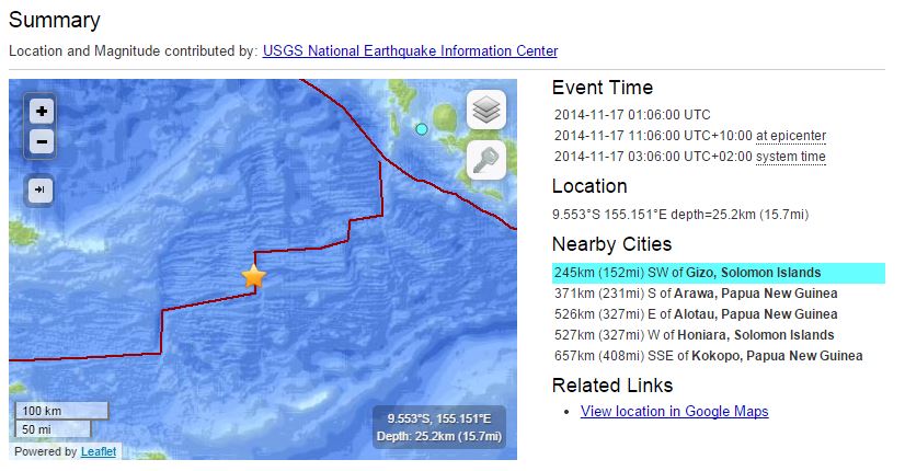 Το επίκεντρο του σεισμού εντοπίστηκε 245 χλμ. νοτιοανατολικά από την πόλη Γκίζο των νήσων Σολομώντα και 371 χλμ. νότια από την πόλη Αράγουα της Νέας Γουινέας . Το εστιακό βάθος εκτιμάται στα 25,2 χλμ.