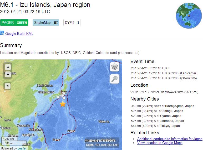 Το επίκεντρο του σεισμού εντοπίζεται σε απόσταση 640 χλμ νοτίως του Τόκιο και 360 χλμ νοτιοδυτικά της Χασίτζο –Τζίμα, με εστιακό βάθος 424 χλμ, προσθέτει το ίδιο Ινστιτούτο.