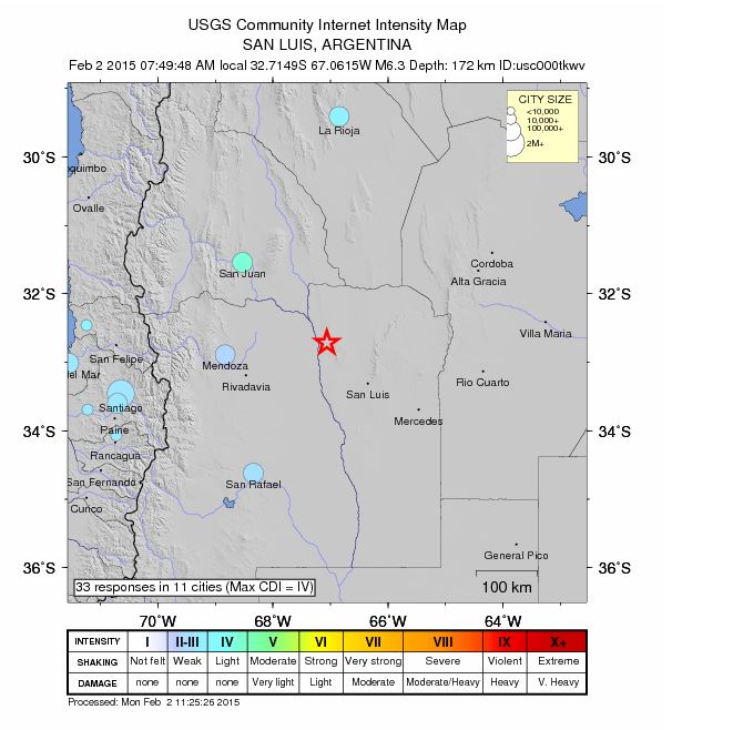 Σεισμική δόνηση μεγέθους 6,3 βαθμών σημειώθηκε στην Αργεντινή, 109 χιλιόμετρα βορειοδυτικά του Σαν Λούις, ανακοίνωσε το Αμερικανικό Ινστιτούτο Γεωλογικής Έρευνας.