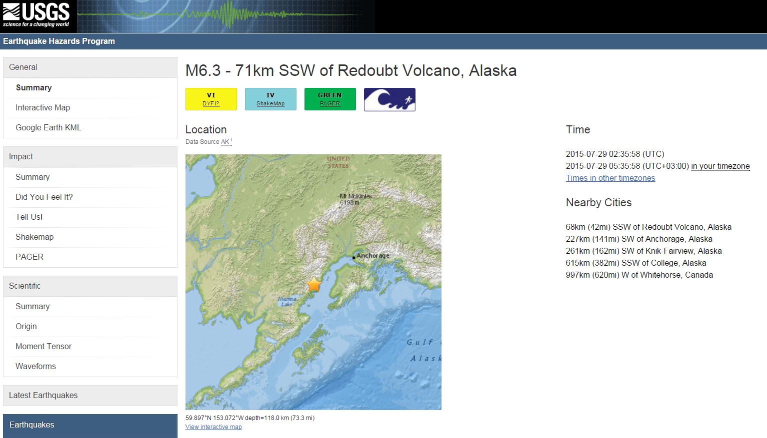 Ο σεισμός σημειώθηκε 64 χιλιόμετρα νότια του όρους Ριντάουτ, που είναι ένα ενεργό ηφαίστειο της Αλάσκας, και 225 χιλιόμετρα νοτιοδυτικά της Άνκορατζ, που είναι η μεγαλύτερη πόλη της πολιτείας, ενώ έγινε αισθητός 241 χιλιόμετρα από το επίκεντρό του, σύμφωνα με το USGS.