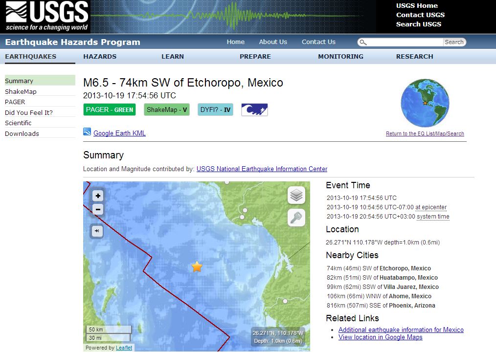 Σύμφωνα με το αμερικανικό σεισμολογικό ινστιτούτο, η δόνηση είχε ένταση 6,5 Ρίχτερ και σημειώθηκε στις 20:52 ώρα Ελλάδος. Το εστιακό βάθος ήταν επιφανειακό και υπήρχε μία μικρή πιθανότητα για τσουνάμι, αλλά δεν εκδόθηκε σχετική προειδοποίηση.