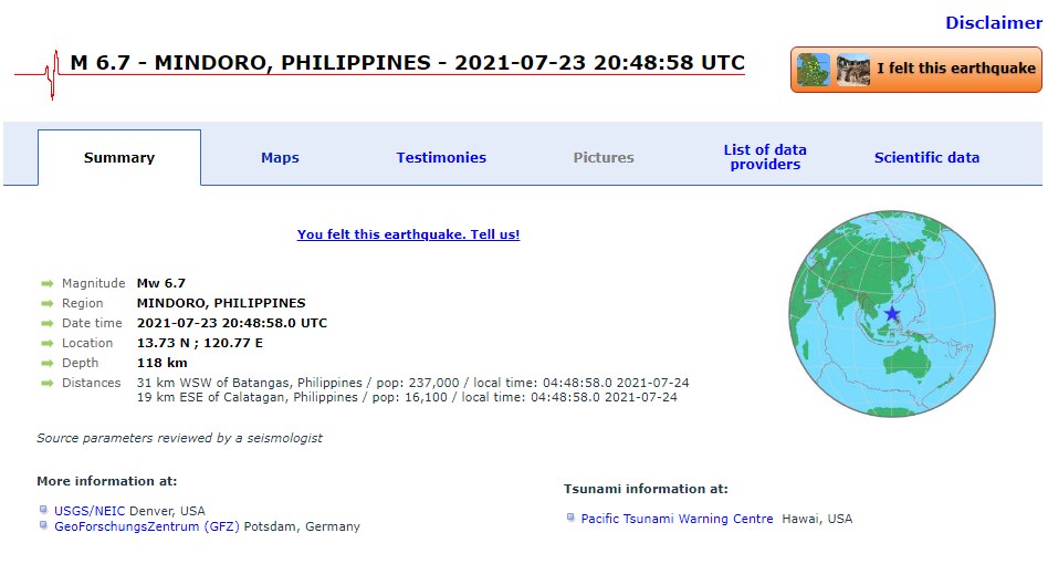 Η δόνηση είχε εστιακό βάθος 118 Χλμ. και επίκεντρο στα 31 Χλμ. δυτικά του Batangas.