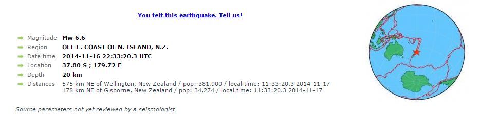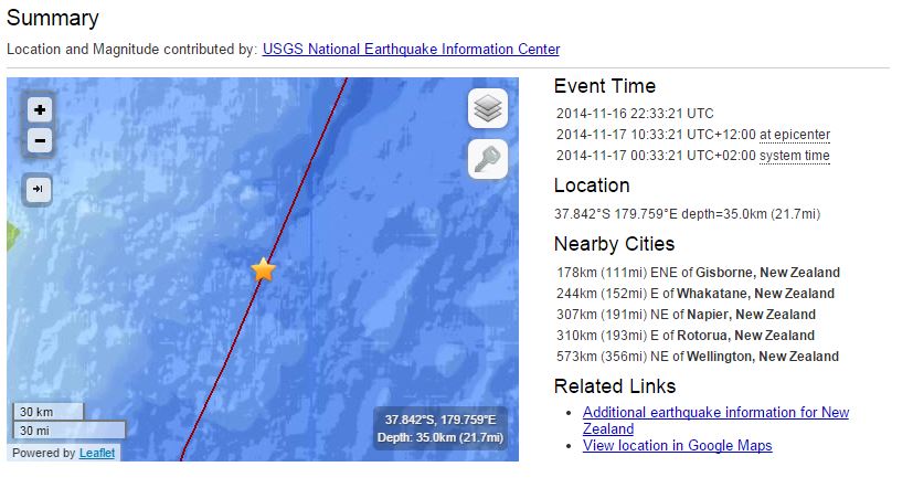 Ο σεισμός, που σημειώθηκε στις 10:33 τοπική ώρα (00:33 της Δευτέρας ώρα Ελλάδας) είχε το επίκεντρό του στη θάλασσα σε απόσταση περίπου 200 χιλιόμετρα από την πόλη Γκίσμπορν που βρίσκεται στο βόρειο νησί της Νέας Ζηλανδίας.