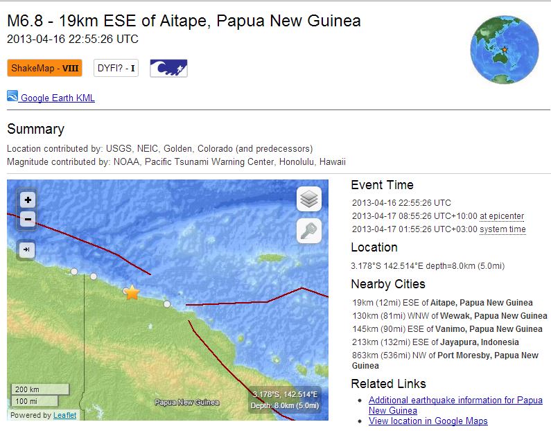 Ισχυρή σεισμική δόνηση εντάσεως 6,8 Ρίχτερ σημειώθηκε στη Νέα Γουινέα στις 2 τα ξημερώματα (ώρα Ελλάδας), σύμφωνα με εκτίμηση του Αμερικανικού Γεωφυσικού Ινστιτούτου (USGS).