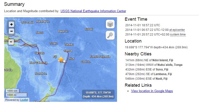 Ο σεισμός είχε επίκεντρο θαλάσσια περιοχή σε απόσταση 140 χιλιομέτρων βορειοανατολικά από τα νησιά Φίτζι και περίπου 300 χιλιόμετρα βόρεια-δυτικά των νησιών Τόνγκα.