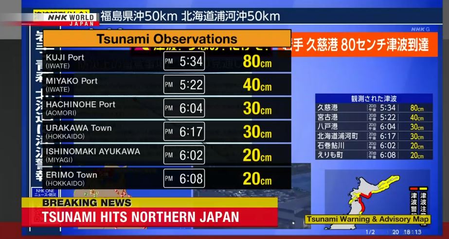 Σύμφωνα με την JMA, τα πρώτα κύματα τσουνάμι έχουν ήδη φτάσει στις ακτές, με το μεγαλύτερο ύψος να καταγράφεται μέχρι στιγμής στα 80 εκατοστά.