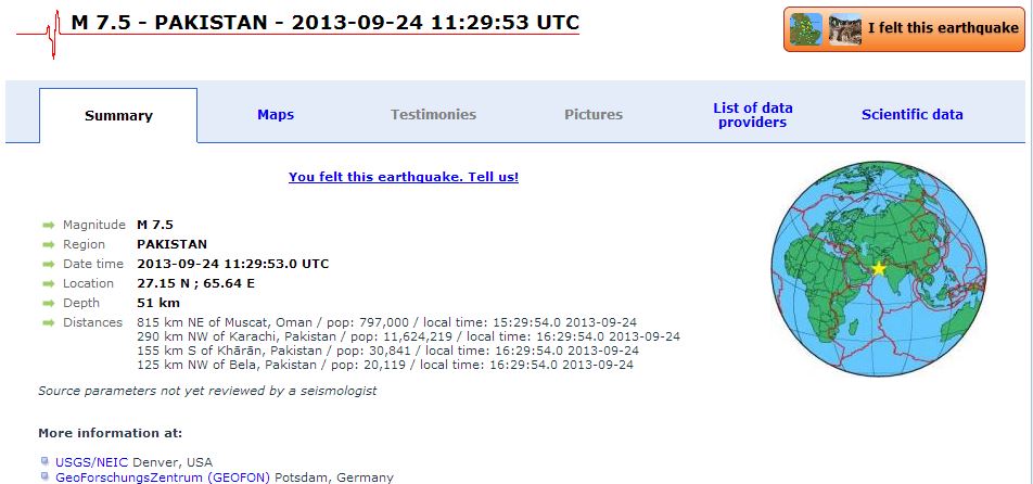 Σύμφωνα με τις προκαταρκτικές μετρήσεις του Ευρωμεσογειακού Σεισμολογικού Ινστιτούτο, το επίκεντρο του σεισμού εντοπίστηκε 290 χιλιόμετρα του Καράτσι, ενώ το εστιακό βάθος μετρήθηκε στα 51 χιλιόμετρα.