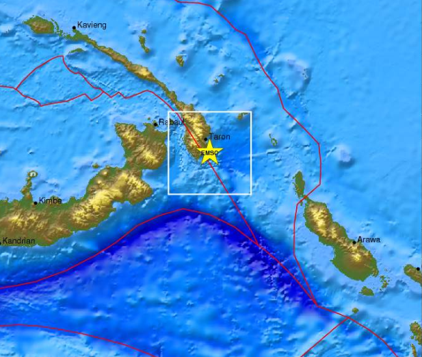 Ισχυρή σεισμική δόνηση μεγέθους 6,7 βαθμών της κλίμακας R σημειώθηκε ανοιχτά της Παπούας-Νέας Γουινέας στις 23.04 ώρα Ελλάδας (06:04 τοπική ώρα), σύμφωνα με το Ευρωμεσογειακό Σεισμολογικό Κέντρο.Το επίκεντρό εντοπίζεται 130 χιλιόμετρα νοτιοανατολικά του Ραμπαούλ, ενώ το εστιακό βάθος υπολογίζεται στα 60 χιλιόμετρα.Σύμφωνα με το Κέντρο Προειδοποιήσεων για Τσουνάμι του Ειρηνικού, από την δόνηση δεν αναμένεται να προκληθεί παλιροϊκό κύμα.