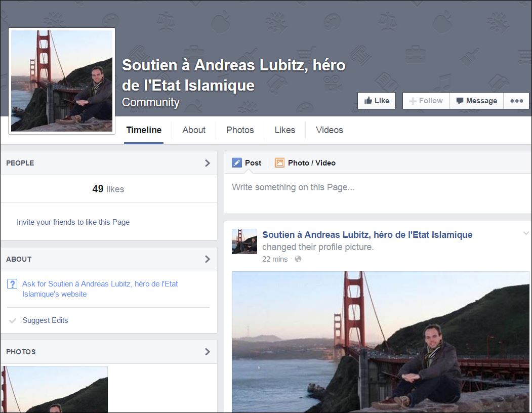 Συγκεκριμένα ανέβηκε στα γαλλικά η σελίδα «Soutien à Andreas Lubitz, héro de l’Etat Islamique», που σημαίνει «Υποστηρίζουμε τον Andreas Lubitz, ήρωας του Ισλαμικού Κράτους».