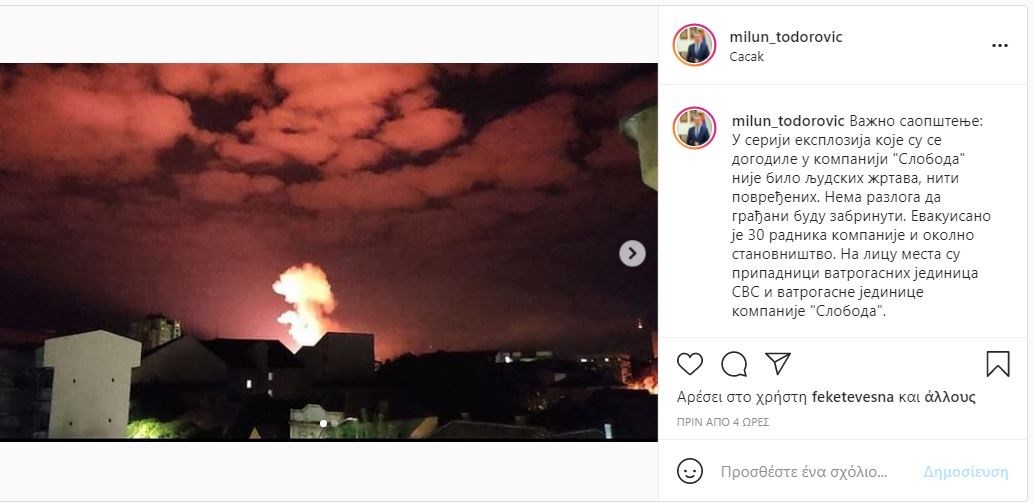Οι εκρήξεις ξεκίνησαν γύρω στη 1.30 ενώ κάτοικοι που ζουν κοντά στο εργοστάσιο καθώς και εργαζόμενοι απομακρύνθηκαν εκκενώνοντας την περιοχή και κανείς δεν τραυματίστηκε σύμφωνα με το Radio Television of Serbia (RTS).