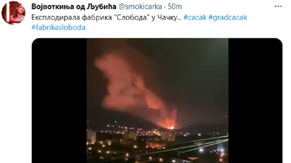 Συναγερμός σήμανε στην πόλη Τσατσάκ της Σερβίας τα ξημερώματα, όταν σημειώθηκαν αλλεπάλληλες εκρήξεις στο εργοστάσιο “Sloboda”, που κατασκευάζει πυρομαχικά για τανκ και πυροβολικό.