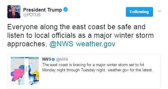 Με ανάρτηση στο Twitter ο πρόεδρος Τραμπ κάλεσε τους κατοίκους των περιοχών που έχουν πληγεί από την κακοκαιρία, να ακολουθήσουν τις οδηγίες των αρχών.