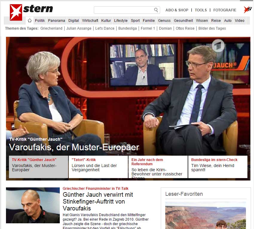 Ολομέτωπη επίθεση σε βάρος του Γιάνη Βαρουφάκη, που εγείρει ερωτήματα, φιλοξενεί το σύνολο του γερμανικού Τύπου στα πρωτοσέλιδα των online εκδόσεων με θέματα που αφορούν στον Έλληνα υπουργό Οικονομικών και στο γερμανικό talk show του Günter Jauch, που τον κατηγόρησε για τη χειρονομία (την οποία ο ίδιος διέψευσε) σε βάρος της Γερμανίας, σε παλαιότερη ομιλία του.
