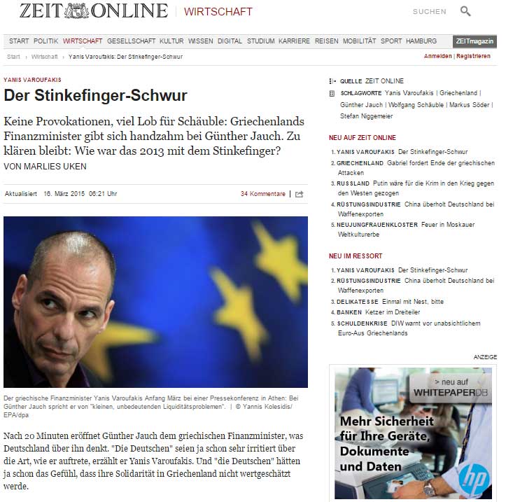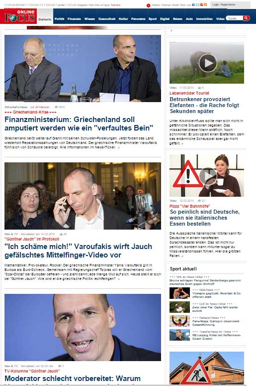 Ολομέτωπη επίθεση σε βάρος του Γιάνη Βαρουφάκη, που εγείρει ερωτήματα, φιλοξενεί το σύνολο του γερμανικού Τύπου στα πρωτοσέλιδα των online εκδόσεων με θέματα που αφορούν στον Έλληνα υπουργό Οικονομικών και στο γερμανικό talk show του Günter Jauch, που τον κατηγόρησε για τη χειρονομία (την οποία ο ίδιος διέψευσε) σε βάρος της Γερμανίας, σε παλαιότερη ομιλία του.