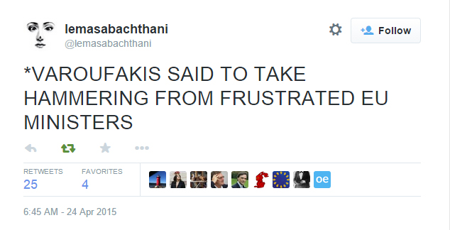 Για «σφυροκόπημα» του Έλληνα υπουργού Οικονομικών, Γιάνη Βαρουφάκη, από τους άλλους υπουργούς Οικονομικών της Ευρωζώνης, κάνουν λόγο οι πληροφορίες που μεταφέρουν οι δημοσιογράφοι από τις Βρυξέλλες.