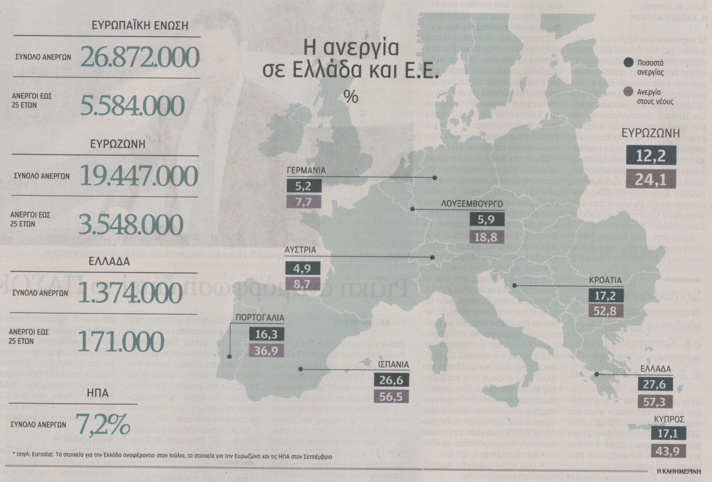 Σχεδόν 27 εκατ. άνθρωποι ήταν άνεργοι στην Ε.Ε. τον Σεπτέμβριο, εκ των οποίων α 19,45 εκατ. βρίσκονται στα κράτη-μέλη της Ευρωζώνης. Στον θλιβερό απολογισμό των ανέργων της Ευρωζώνης προστέθηκαν 68.000 ακόμη άτομα σε σχέση με τον περασμένο μήνα και περίπου ένα εκατομμύριο σε σχέση με τον Σεπτέμβριο του 2012.