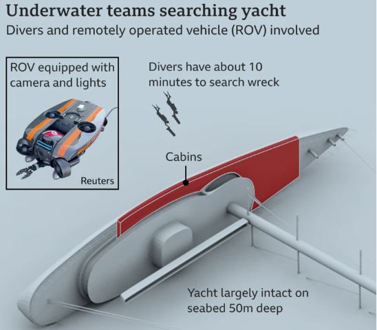 Η ομάδα έρευνας και διάσωσης έχει αναπτύξει από το πρωί σήμερα (21/08) τηλεχειριζόμενα υποβρύχια οχήματα για να έχουν ευκολότερη πρόσβαση στο σκάφος.
