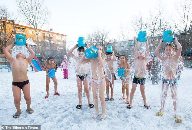 Τα παιδιά σε ένα νηπιαγωγείο της Σιβηρίας αποδεικνύουν ότι το κρύο είναι μόνο μια ιδέα. Οι μαθητές ως μέρος του προγράμματος σπουδών. βγάζουν τα ρούχα τους και μένουν μόνο με τα εσώρουχά τους. Στη συνέχεια κάνουν ντους ρίχνοντας έναν κουβά με νερό πάνω από το κεφάλι τους. Στο κρατικό νηπιαγωγείο στο Κρασνογιάρσκ της Σιβηρίας, το ντους στην αυλή του σχολείου πιστεύεται ότι διατηρεί τα παιδιά υγιή και σταματά τις μολύνσεις. Τα παιδιά κάνουν το κρύο ντους καθημερινά έπειτα από μια καυτή σάουνα, εφόσον η θερμοκρασία δεν είναι χαμηλότερη από -25C.