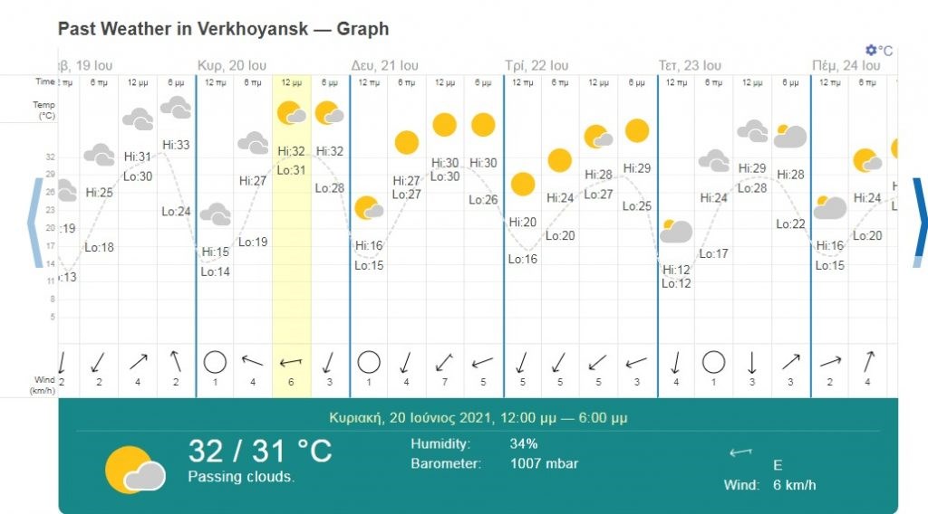 Σημειώνεται ότι όπως βλέπετε και παρακάτω ότι η θερμοκρασία της ατμόσφαιρας στην πόλη Βερχογιάνσκ στις 20 Ιουνίου του 2021 δεν ξεπέρασε τους 32°C.