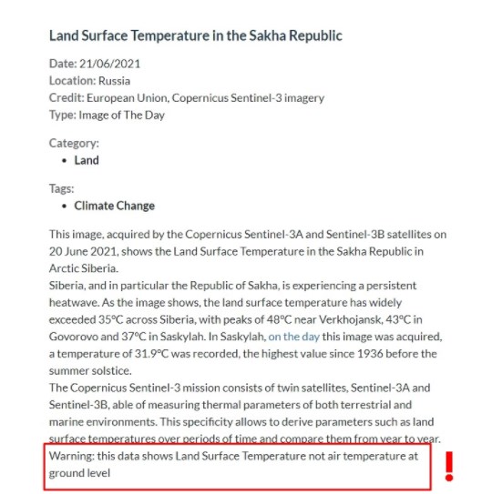 Σύμφωνα με τα ellnikahoaxes.gr, στις 21 Ιουνίου του 2021, στη συλλογή “Φωτογραφίες της Ημέρας” του προγράμματος Copernicus προστέθηκε μια νέα δορυφορική λήψη από τους Sentinel-3A και Sentinel-3B. Στη φωτογραφία, απεικονιζόταν η Δημοκρατία των Σαχά στην Αρκτική Σιβηρία. Στο σχετικό υπόμνημα που εντοπίζεται στην προαναφερθείσα ενότητα, καθίσταται σαφές ότι στη δορυφορική λήψη απεικονίζονται οι θερμοκρασίες της επιφάνειας του εδάφους (Land Surface Temperature) των εν λόγω ρωσικών πόλεων και όχι η θερμοκρασία του αέρα στο επίπεδο του εδάφους (Air Temperature at Ground Level).