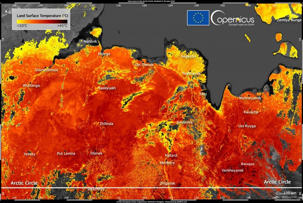 Οι εικόνες από τους δορυφόρους του προγράμματος “Κοπέρνικος” που αποτυπώνουν «στα κόκκινα» πολλές από τις πόλεις της Σιβηρίας έκαναν τον γύρο του κόσμου, καθώς δείχνουν ότι η θερμοκρασία στην επιφάνεια του εδάφους κυμαίνεται από 35°C έως 48°C.