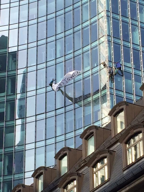 Ακτιβιστές που παίρνουν μέρος στις διαδηλώσεις κατά της λιτότητας στη Φρανκφούρτη σκαρφάλωσαν στο κτίριο της ΕΚΤ προκειμένου να αναρτήσουν πανό.