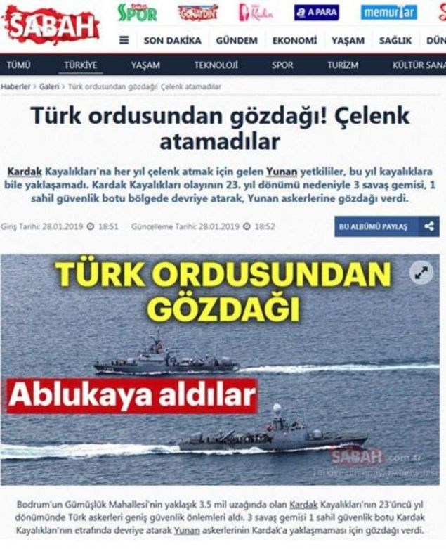 Αναφέροντας «ελληνική πρόκληση», τα τουρκικά Μέσα Ενημέρωσης εννοούν την προσέγγιση των Ιμίων για την κατάθεση στεφάνων.Πολλοί, μάλιστα, τηλεοπτικοί σταθμοί της γείτονας έχουν στείλει συνεργεία στα παράλια, μεταδίδοντας εικόνες από τα τουρκικά πλοία που «περιπολούν» την περιοχή.Την ίδια στιγμή στα social media, Τούρκοι χρήστες καυχιούνται για τη μη κατάθεση… στεφάνου τη Δευτέρα από την ελληνική πλευρά, ενώ δημοσιεύουν και τα βίντεο με τα τουρκικά πλοία στην περιοχή. «Κάθε χρόνο οι Ελληνες επισκέπτονται τα Ίμια για τη ρίψη στεφάνων. Φέτος δεν τα κατάφεραν», αναφέρει χαρακτηριστικά ένα από τα tweet.