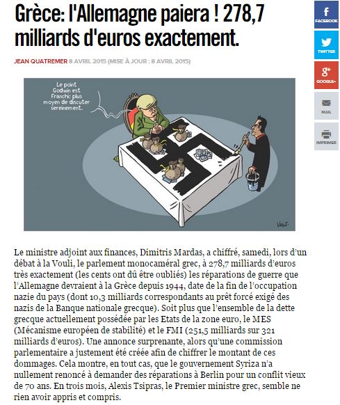 Ένα σκίτσο που φέρει την υπογραφή του Νικολά Βαντό κοσμεί το άρθρο του Ζαν Κατρεμέρ, ανταποκριτή της εφημερίδας «Liberation» στις Βρυξέλλες, απεικονίζοντας τον Έλληνα πρωθυπουργό σε ρόλο ζωγράφου να σχηματίζει μία σβάστικα και τη Γερμανίδα καγκελάριο, Άνγκελα Μέρκελ, να παρακολουθεί με προσοχή το έργο του Αλέξη Τσίπρα.