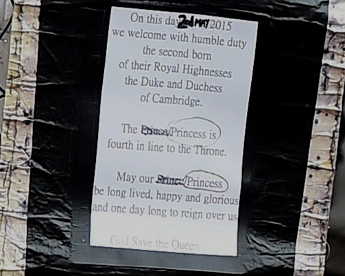 Φυσικά το πριγκιπικό ζεύγος δεν ήθελε κανείς να γνωρίζει το φύλο του παιδιού για να μην διαρρεύσει στον Τύπο και το κοινό και γι’ αυτό στο επίσημο έγγραφο που συνέταξε αναφέρονται και ο πρίγκιπας και η πριγκίπισσα.
