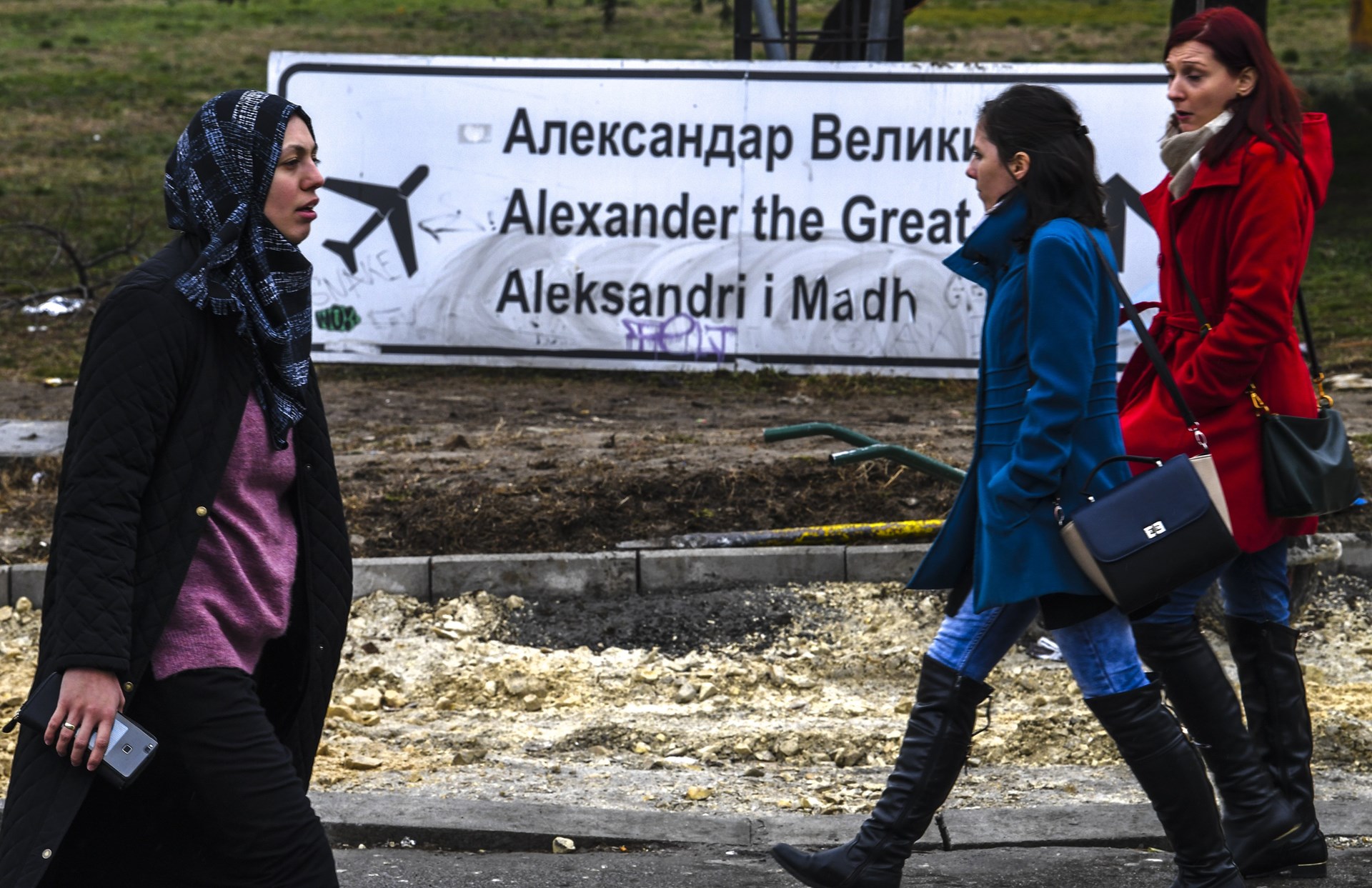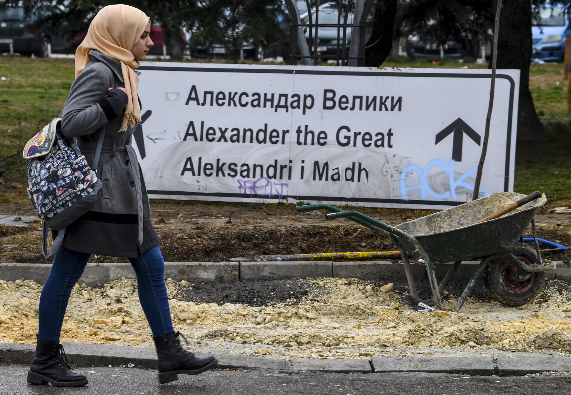 Στην άκρη του δρόμου βρίσκεται πλέον η πινακίδα, στην οποία αναγράφεται η ονομασία “Μέγας Αλέξανδρος” και δείχνει την κατεύθυνση προς το αεροδρόμιο των Σκοπίων.