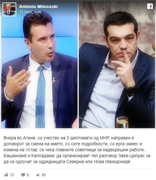 «Xθες στην Αθήνα, με τη συμμετοχή τριών διπλωματών από το Υπουργείο Εξωτερικών (σ.σ.: της ΠΓΔΜ), επήλθε η συμφωνία για την αλλαγή του ονόματος με όλες τις λεπτομέρειες, erga omnes και μια αναθεώρηση του Συντάγματος. Πλέον, περιμένουμε από τους συμβούλους των δύο χωρών, Μπασάνοβιτς και Καλπαδάκη, να οργανώσουν μια τηλεφωνική επικοινωνία ανάμεσα στον Ζόραν Ζάεφ και τον Αλέξη Τσίπρα για να αποφασίσουν για το όνομα Βόρεια ή Νέα Μακεδονία», έγραψε συγκεκριμένα ο κ. Μιλόσοσκι.