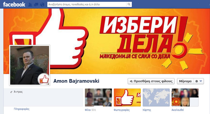 Ο Άμον Μπαϊραμόφσκι, Γεν��κός Πρόξενος των Σκοπίων στην Βενετία, στην προσωπική σελίδα του στο facebook, δεν τηρεί ούτε καν τα προσχήματα, καθώς έχει αναρτήσει έναν χάρτη της λεγόμενης «Ενωμένης Μακεδονίας», σύμβολο του Σκοπιανού επεκτατισμού.