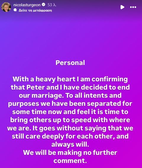 Η πρώην Πρώτη Υπουργός της Σκωτίας, Νίκολα Στέρτζιον, ανακοίνωσε σήμερα τη λήξη του γάμου της με τον Πίτερ Μέρελ, πρώην εκτελεστικό διευθυντή του Σκωτσέζικου Εθνικού Κόμματος (SNP).