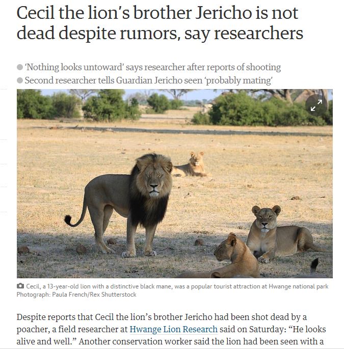 Ωστόσο, ο Guardian αναφέρει ότι η τραγική είδηση που θέλει να είναι νεκρός και ο Τζέρικο δεν ισχύει. Μάλιστα επικαλείται ερευνητές που παρακολουθούν το λιοντάρι και οι οποίοι τονίζουν ότι ο Τζέρικο είναι ζωντανός και εθεάθη νωρίτερα με ένα θηλυκό λιοντάρι πιθανόν να ζευγαρώνει.