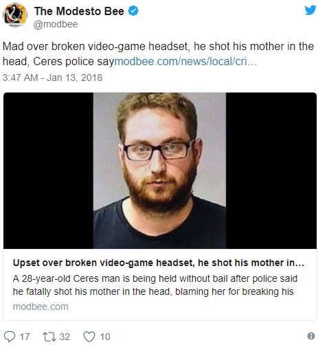 Ένας 28χρονος άνδρας συνελήφθη στη Βόρεια Καλιφόρνια επειδή σκότωσε τη μητέρα του. Ο λόγος; Οι αρχές δήλωσαν ότι την κατηγόρησε ότι έσπασε τα ακουστικά για τα βιντεοπαιχνίδια του, με αποτέλεσμα τον θάνατο της γυναίκας.
