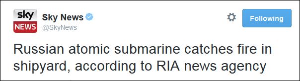 Φωτιά ξέσπασε σε πυρηνικό υποβρύχιο της Ρωσίας σε ναυπηγείο, όπως μετέδωσε στο Twitter το Sky News επικαλούμενο τηλεγράφημα του πρακτορείου ειδήσεων RIA. Μέχρι στιγμής δεν υπάρχουν περισσότερες πληροφορίες.