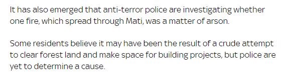 Σε δημοσίευμα της ιστοσελίδας του βρετανικού δικτύου, Skynews, αναφέρεται ότι κλιμάκιο της Αντιτρομοκρατικής εξετάζει το ενδεχόμενο η φονική πυρκαγιά που έπληξε το Μάτι να είναι προϊόν εμπρησμού.Σύμφωνα με το ρεπορτάζ του βρετανικού δικτύου, κάτοικοι της περιοχής εκφράζουν τη βεβαιότητα ότι η συγκεκριμένη πυρκαγιά ήταν αποτελέσμα μίας βίαιης προσπάθειας να καταστραφεί το δάσος, προκειμένου να δημιουργηθεί χώρος για την ανέγερση νέων κτιρίων. Και ταυτόχρονα επισημαίνεται ότι η ΕΛ.ΑΣ. δεν έχει αποσαφηνίσει ακόμα τα αιτία που προκάλεσαν τη φονική φωτιά που έχει στοιχίσει έως τώρα τη ζωή σε 81 ανθρώπους.