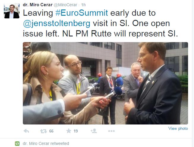«Φεύγοντας νωρίς από τη Σύνοδο Κορυφής εξαιτίας της συνάντησης με τον Γενς Στόλτενμπεργκ στη Σλοβενία. Ένα θέμα ακόμα ανοιχτό. Ο Ολλανδός πρωθυπουργός Ρούτε θα εκπροσωπήσει τη Σλοβενία», έγραψε χαρακτηριστικά στο twitter ο Σλοβένος πρωθυπουργός.