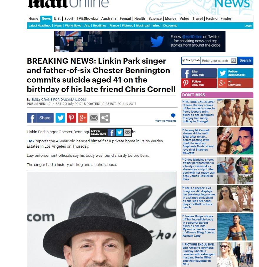 Σοκ, συγκίνηση και θλίψη στο παγκόσμιο μουσικό στερέωμα προκάλεσε η είδηση της αυτοκτονίας του 41χρονου τραγουδιστή των Linkin Park, Chester Bennington.